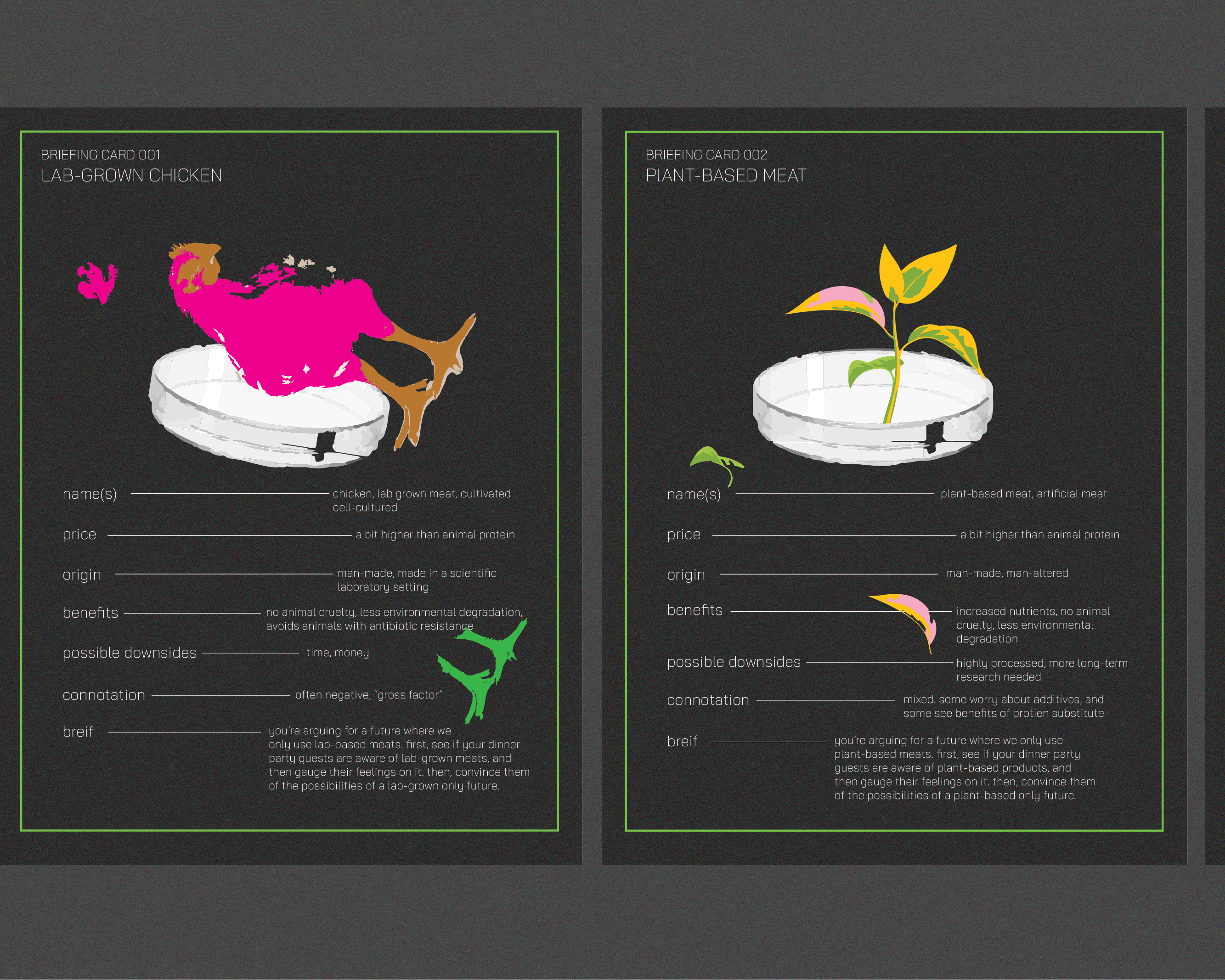 BRIEF: You’re arguing for a future where we only use lab-based meats. first, see if your dinner party guests are aware of lab-grown meats, and then gauge their feelings on it. then, convince them of the possibilities of a lab-grown-only future.