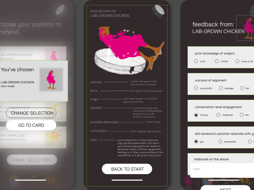 I took what I learned from the staged conversation and use it to foster others like it, but in order to have successful conversations, people need a bit more background on the subject(s) to get started. This project is part performance, part role-playing game staged at a pop-up dinner party. Participants will be given a set menu where they can choose their position, they then get a briefing card based on their position, which tells them a bit about what they're defending.